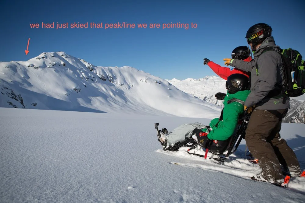 Aside from lots of powder and that holy shit feeling of “Yes!”, the narratives didn’t quite line up. Which isn’t surprising given how rarefied heli-skiing is for your average skier let alone a sit skier. Nevertheless, it was a beautiful incongruity to experience, because my dreams were never about *how* I was skiing, only that I *was* skiing.